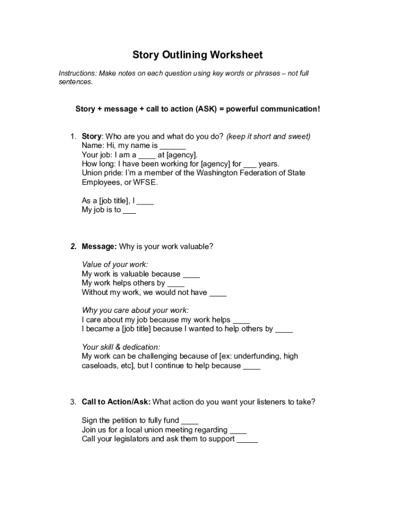 Story Outlining Worksheet Instructions: Make notes on each question using keywords or phrases not full sentences. Story + message + call to action (ASK) powerful communication! 1. Story: Who are you,