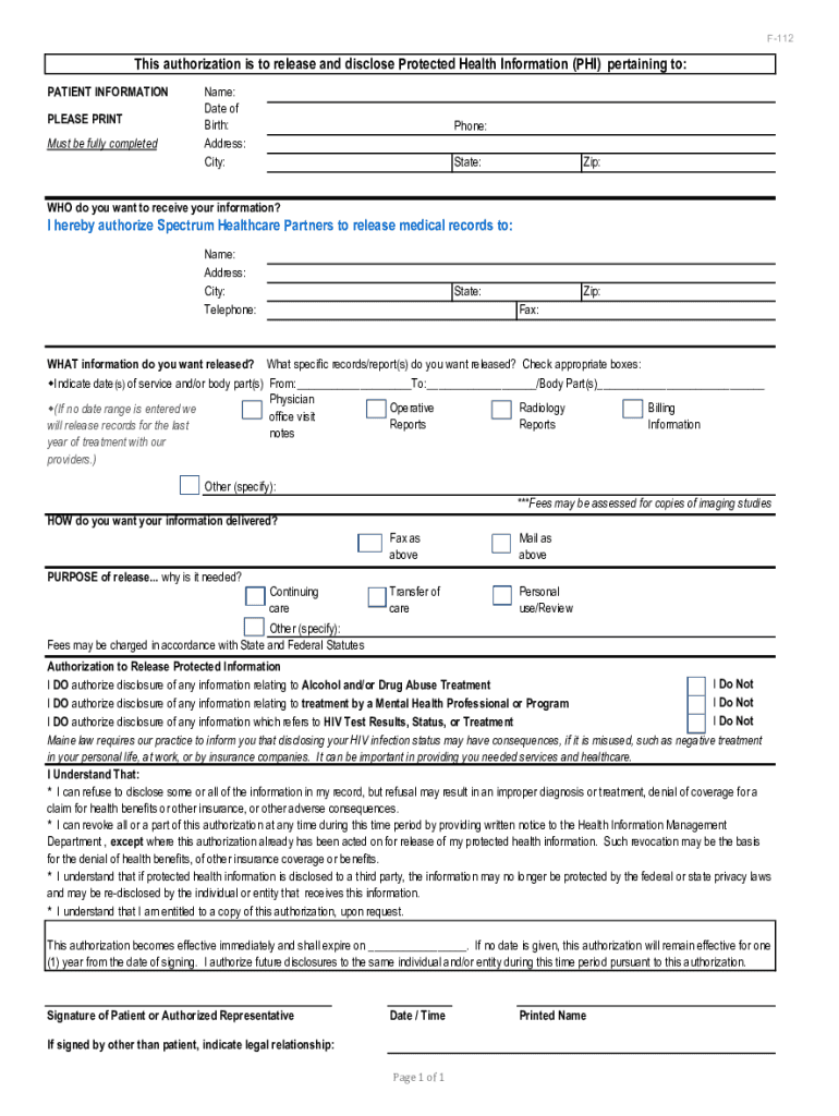 F112This authorization is to release and disclose Protected Health Information (PHI) pertaining to: PATIENT INFORMATION PLEASE PRINT Must be fully completedName: Date of Birth: Address: City:Phone: