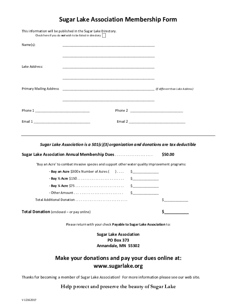 Sugar Lake Association Membership Form This information will be published in the Sugar Lake Directory. Check here if you do not wish to be listed in directory __Name(s):___ ___Lake Address:___ ___Primary
