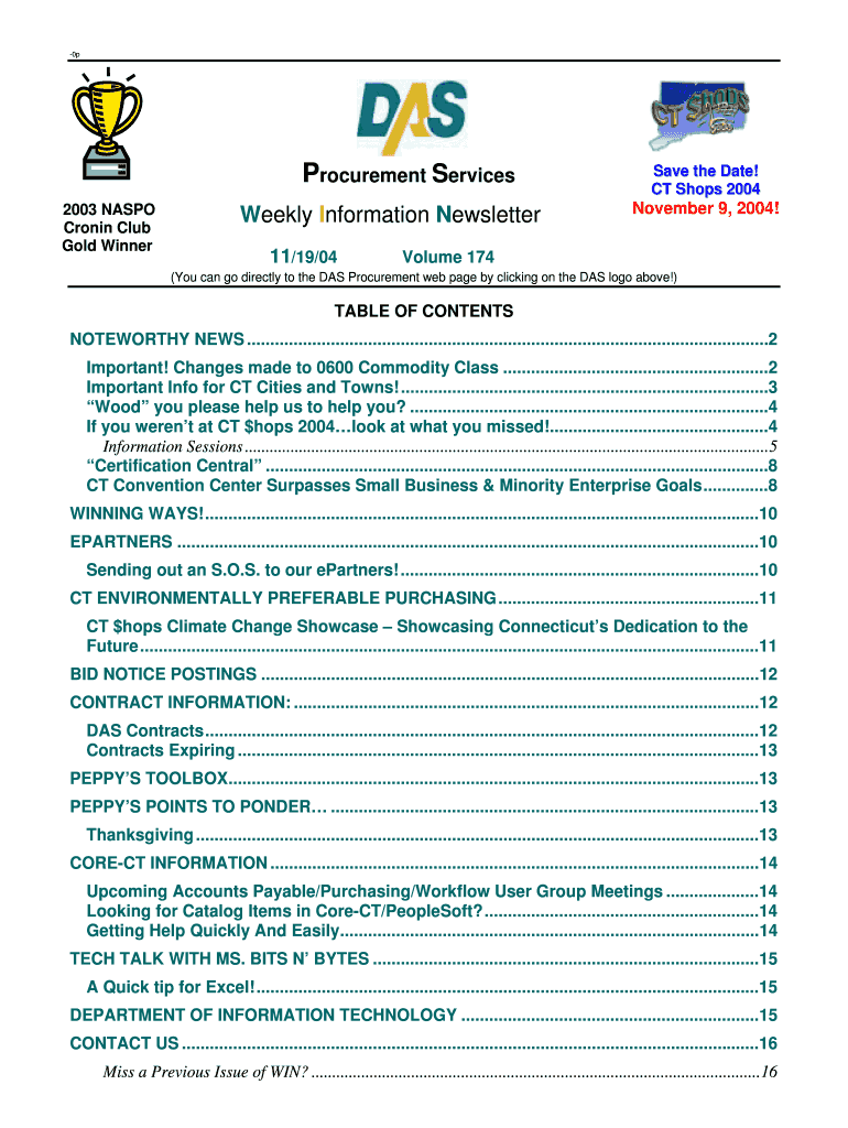 0p Procurement Services 2003 NAS PO Cronin Club Gold Winner Weekly Information Newsletter 11/19/04 Save the Date! CT Shops 2004 November 9, 2004! Volume 174 (You can go directly to the WAS Procurement