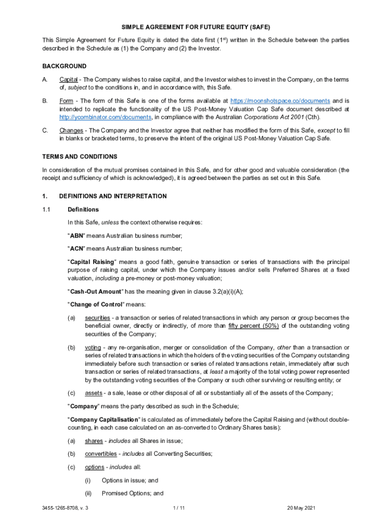 SIMPLE AGREEMENT FOR FUTURE EQUITY (SAFE) This Simple Agreement for Future Equity is dated the date first (1st) written in the Schedule between the parties described in the Schedule as (1) the Company
