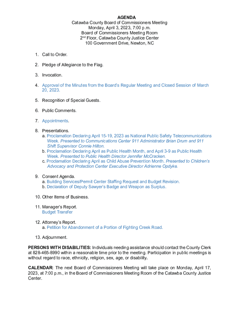 AGENDA Catawba County Board of Commissioners Meeting Monday, April 3, 2023, 7:00 p.m. Board of Commissioners Meeting Room 2nd Floor, Catawba County Justice Center 100 Government Drive, Newton, NC