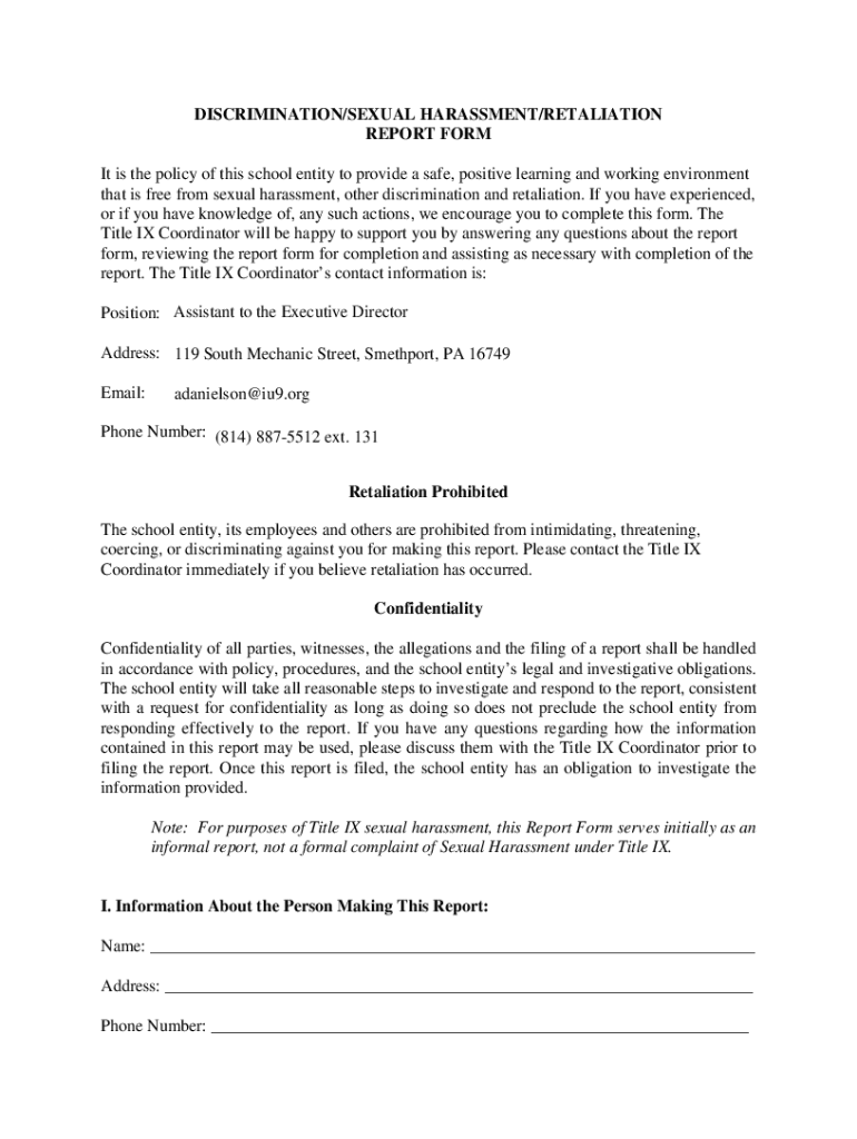 DISCRIMINATION/SEXUAL HARASSMENT/RETALIATION REPORT FORM It is the policy of this school entity to provide a safe, positive learning and working environment that is free from sexual harassment, other