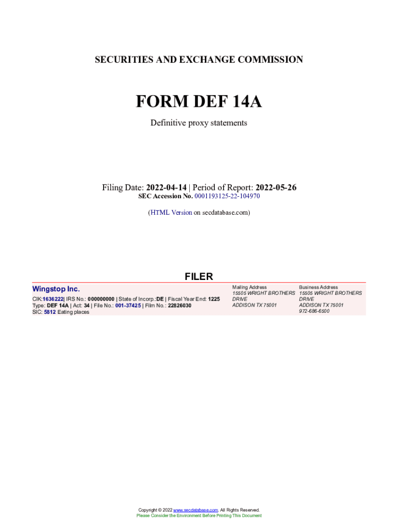 Get the free Wingstop Inc. Form DEF 14A Filed 2022-04-14. Accession Number