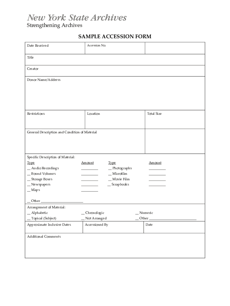 Strengthening Archives SAMPLE ACCESSION FORM Accession No. Date Received Title Creator Donor Name/AddressRestrictionsLocationTotal SizeGeneral Description and Condition of MaterialSpecific Description