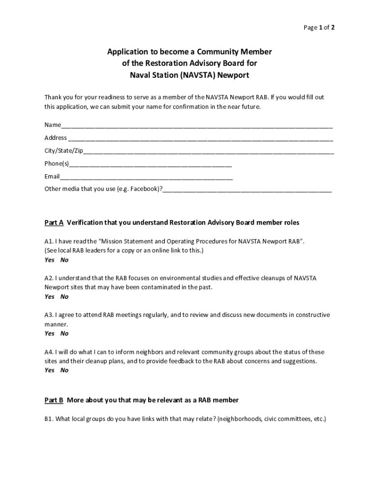 Page 1 of 2Application to become a Community Member of the Restoration Advisory Board for Naval Station (NASA) Newport Thank you for your readiness to serve as a member of the NASA Newport RAB. If