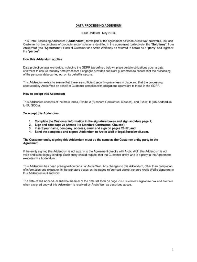 DATA PROCESSING ADDENDUM (Last Updated: May 2023) This Data Processing Addendum (Addendum) forms part of the agreement between Arctic Wolf Networks, Inc. and Customer for the purchase of products