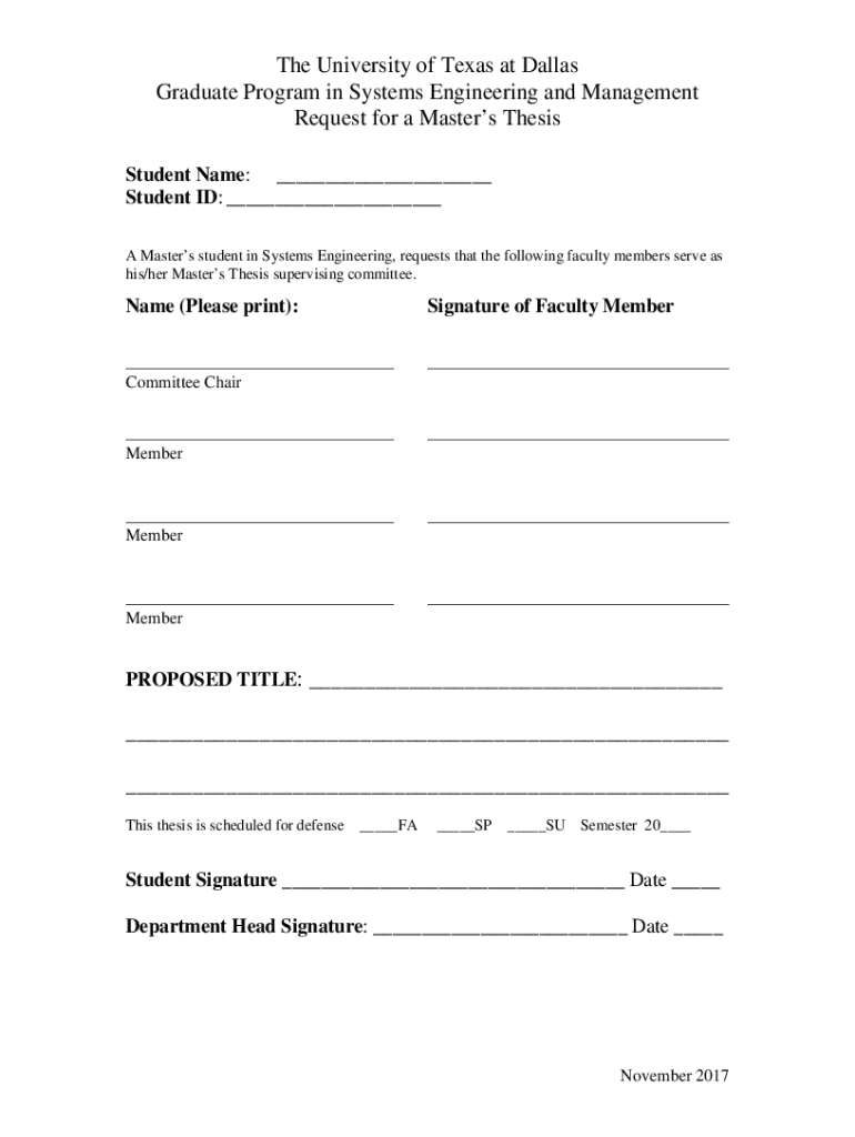 The University of Texas at Dallas Graduate Program in Systems Engineering and Management Request for a Master’s Thesis Student Name: ___ Student ID: ___ A Masters student in Systems Engineering,