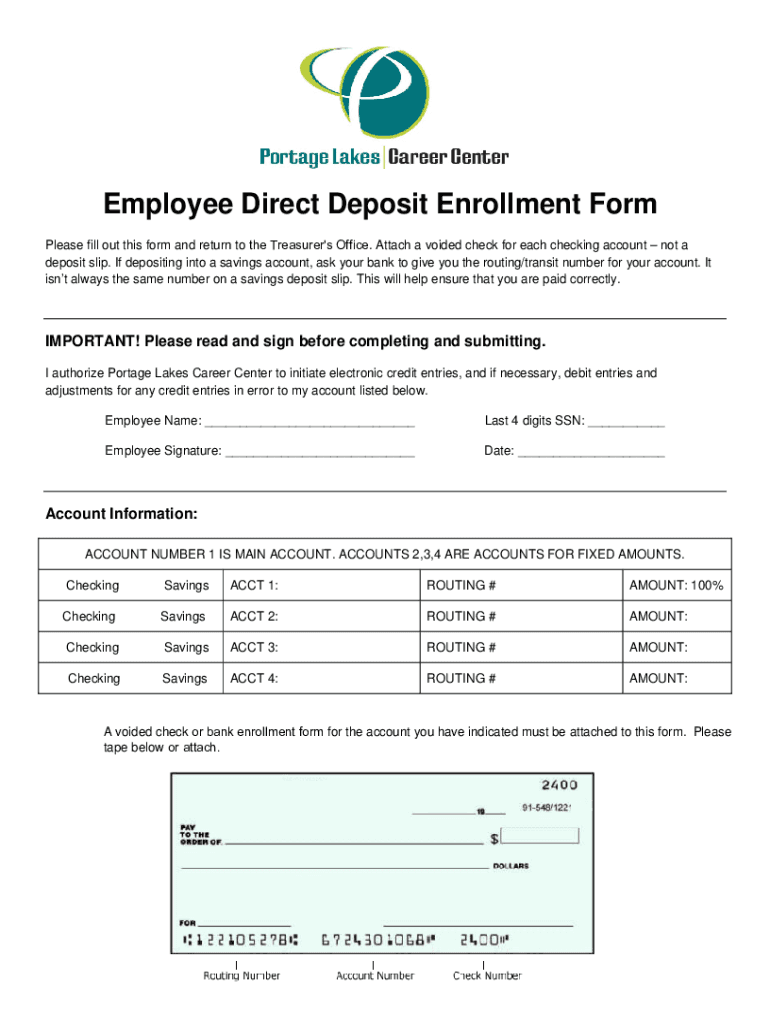 Employee Direct Deposit Enrollment Form Please fill out this form and return to the Treasurer\'s Office. Attach a voided check for each checking account not a deposit slip. If depositing into a savings