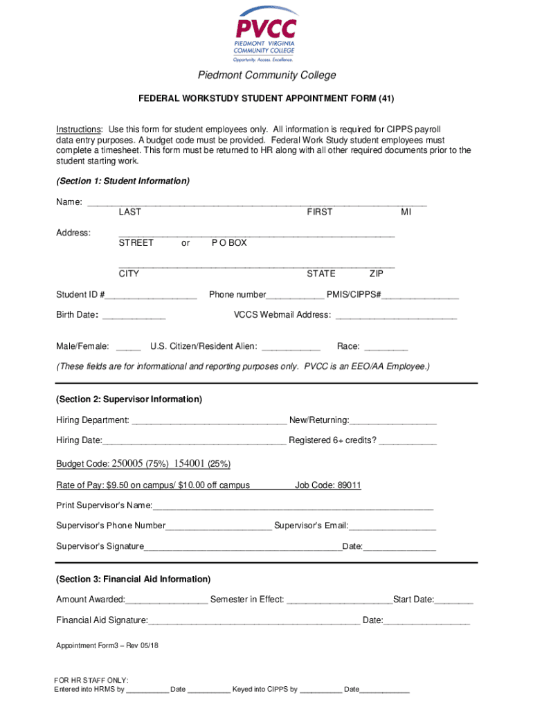 Piedmont Community College FEDERAL WORSTED STUDENT APPOINTMENT FORM (41)Instructions: Use this form for student employees only. All information is required for CPPS payroll data entry purposes. A