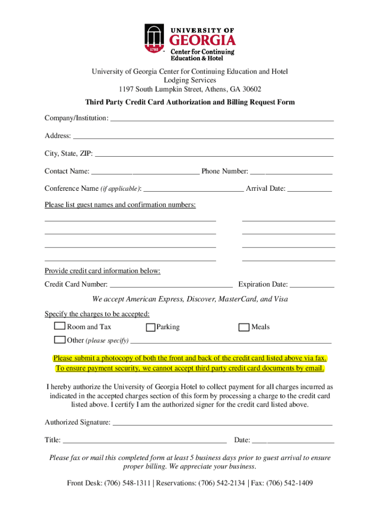 University of Georgia Center for Continuing Education and Hotel Lodging Services 1197 South Lumpkin Street, Athens, GA 30602 Third Party Credit Card Authorization and Billing Request Form Company/Institution: