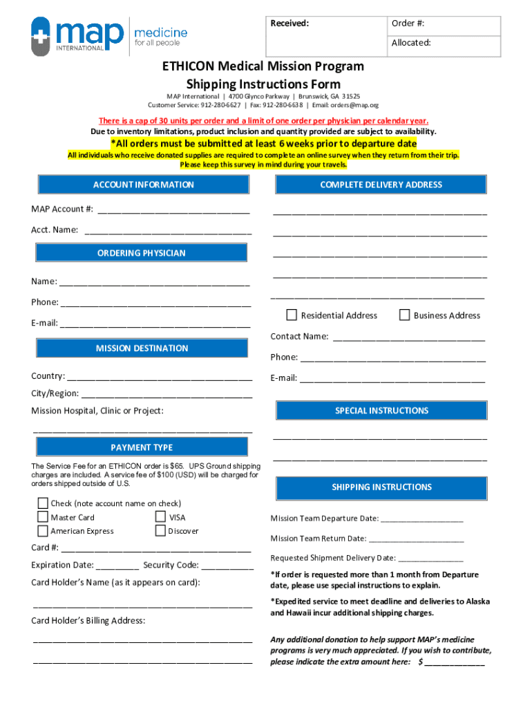 Received:Order #: Allocated:ETHICON Medical Mission Program Shipping Instructions Form MAP International | 4700 Lynch Parkway | Brunswick, GA 31525 Customer Service: 9122806627 | Fax: 9122806638 |