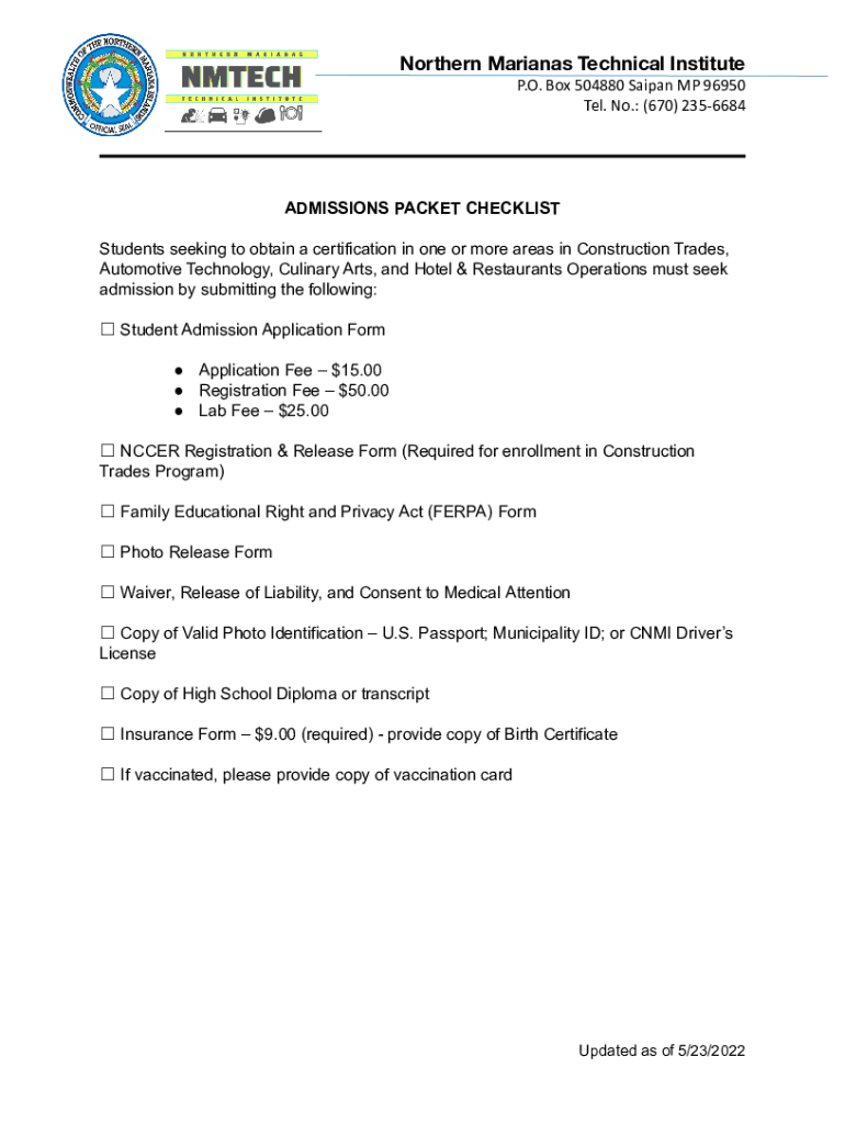 Northern Marianas Technical Institute P.O. Box 504880 Sampan MP 96950 Tel. No.: (670) 2356684ADMISSIONS PACKET CHECKLIST Students seeking to obtain a certification in one or more areas in Construction