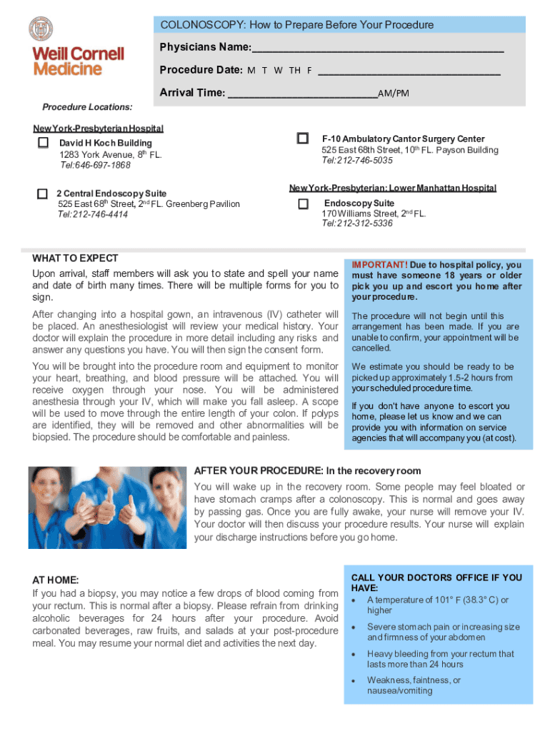 COLONOSCOPY: How to Prepare Before Your Procedure Physicians Name:___ Procedure Date: M T W TH F ___ Arrival Time: ___AM/PM Procedure Locations: New York Presbyterian HospitalF10 Ambulatory Cantor