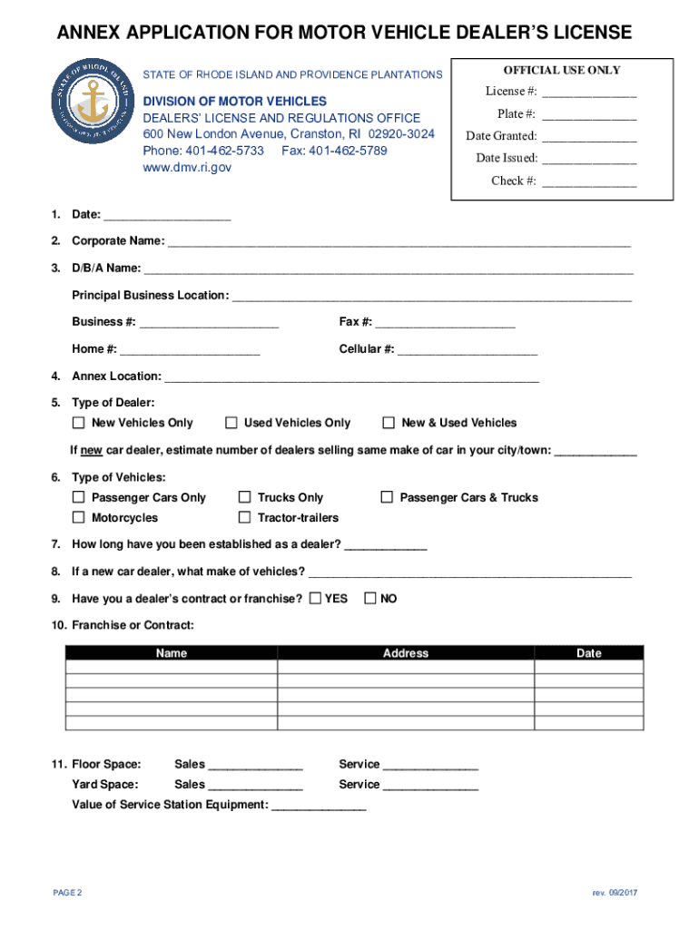 STATE OF RHODE ISLAND AND PROVIDENCE PLANTATIONSDIVISION OF MOTOR VEHICLES DEALERS LICENSE AND REGULATIONS OFFICE600 New London Avenue, Cranston, RI 029203024 Phone: 4014625733 Fax: 4014625789 www.dmv.ri.govINSTRUCTIONS