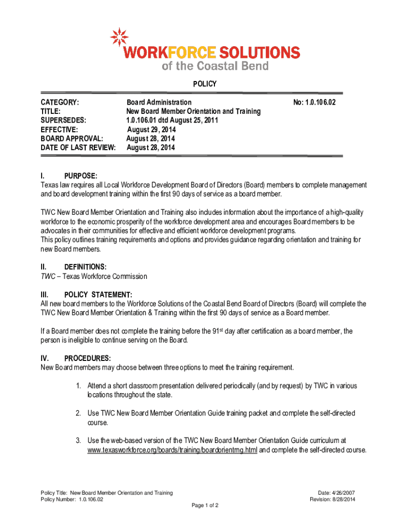 POLICY CATEGORY: TITLE: SUPERSEDES: EFFECTIVE: BOARD APPROVAL: DATE OF LAST REVIEW:Board Administration New Board Member Orientation and Training 1.0.106.01 did August 25, 2011, August 29, 2014, August