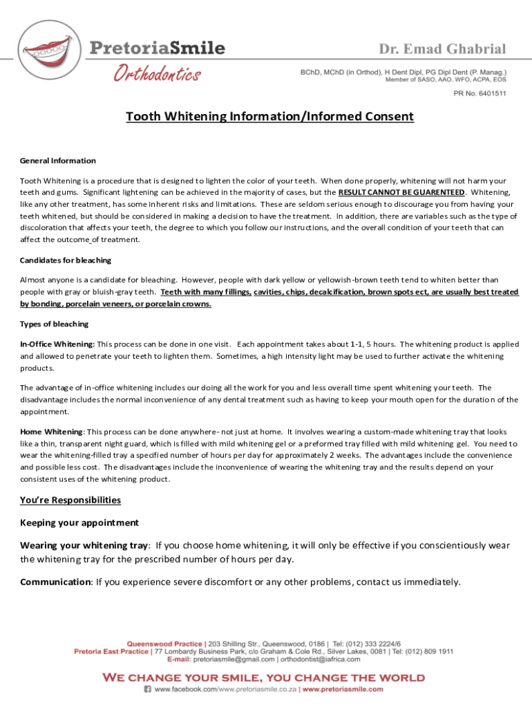 Tooth Whitening Information/Informed Consent General Information Tooth Whitening is a procedure that is designed to lighten the color of your teeth. When done properly, whitening will not harm your