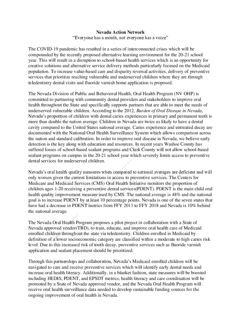 Nevada Action Network Everyone has a mouth, not everyone has a voice The COVID-19 pandemic has resulted in a series of interconnected crises which will be compounded by the recently proposed alternative