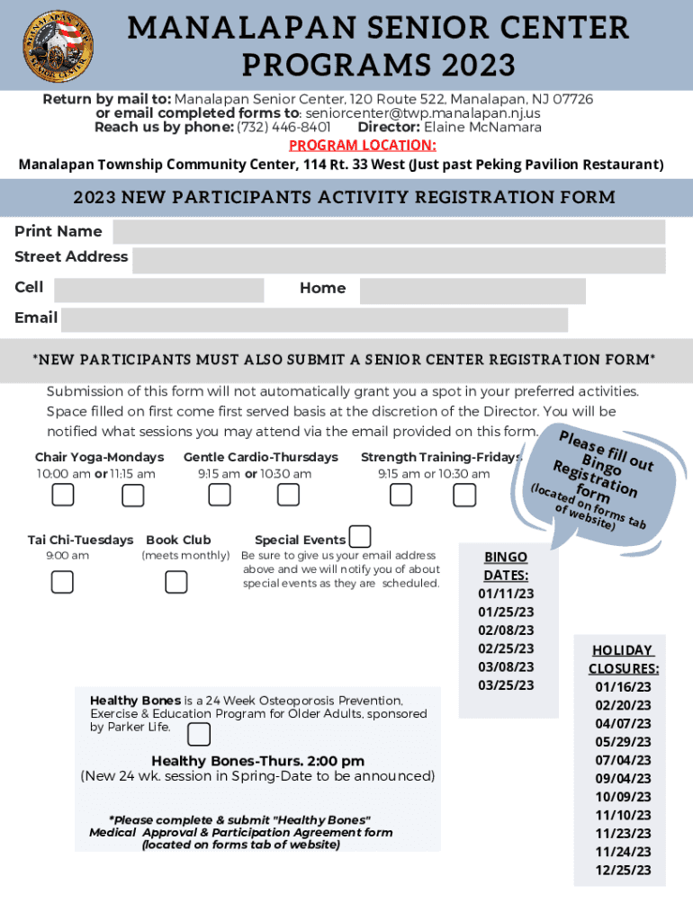 MANALAPAN SENIOR CENTER PROGRAMS 2023 Return by mail to: Manalapan Senior Center, 120 Route 522, Manalapan, NJ 07726 or email completed forms to: seniorcenter@twp.manalapan.nj.us Reach us by phone: