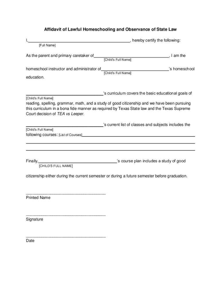 Affidavit of Lawful Homeschooling and Observance of State Law