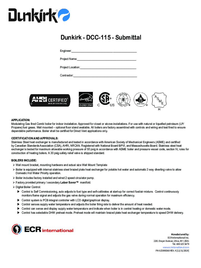 Dunkirk DCC115 Submittal Engineer:___ Project Name:___ Project Location:___ Contractor:___APPLICATION: Modulating Gas fired Comb boiler for indoor installation. Approved for closet or alcove installations.