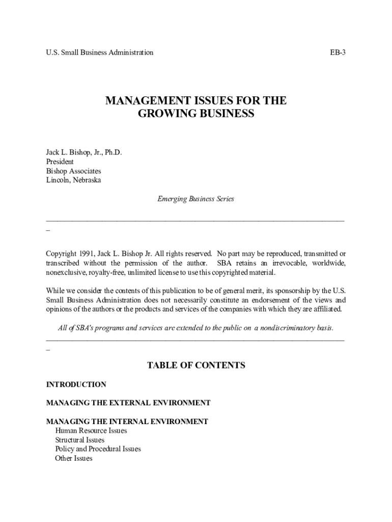 U.S. Small Business AdministrationEB3MANAGEMENT ISSUES FOR THE GROWING BUSINESS Jack L. Bishop, Jr., Ph.D. President Bishop Associates Lincoln, Nebraska Emerging Business Series ___ _ Copyright 1991,