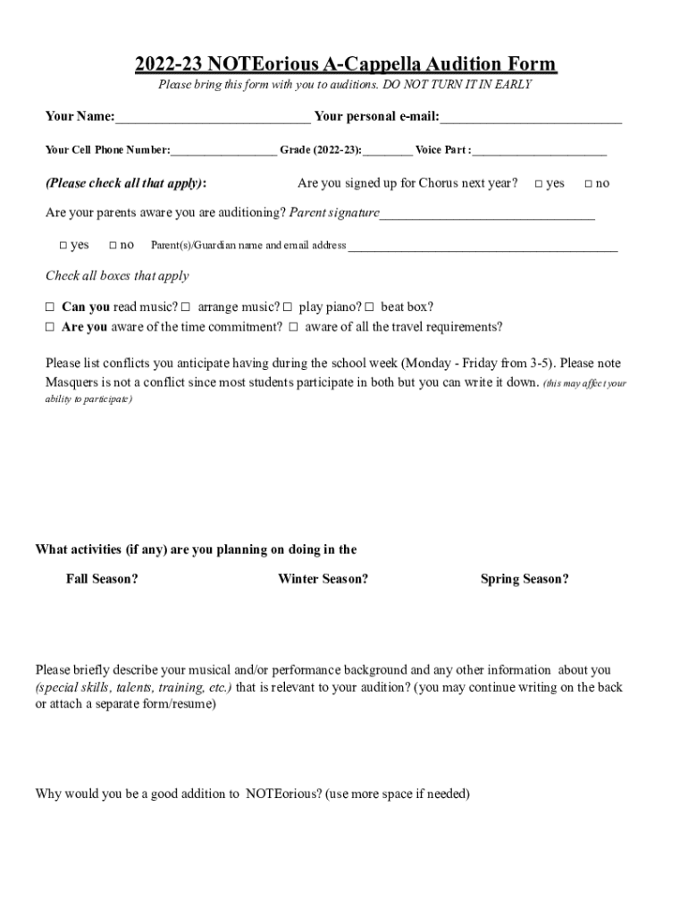 202223 Notorious A cappella Audition Form Please bring this form with you to auditions. DO NOT TURN IT IN EARLYYour Name:___ Your personal email:___ Your Cell Phone Number:___ Grade (202223):___ Voice