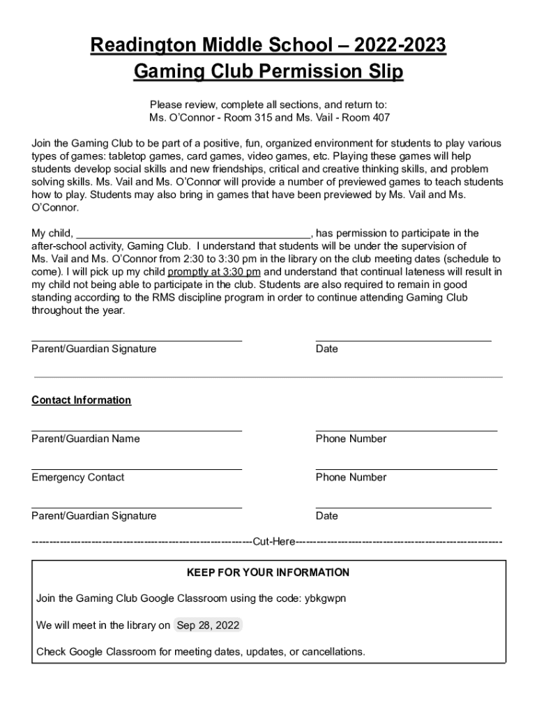 Reading ton Middle School 20222023 Gaming Club Permission Slip Please review, complete all sections, and return to: Ms. O'Connor Room 315 and Ms. View Room 407 Join the Gaming Club to be part of a