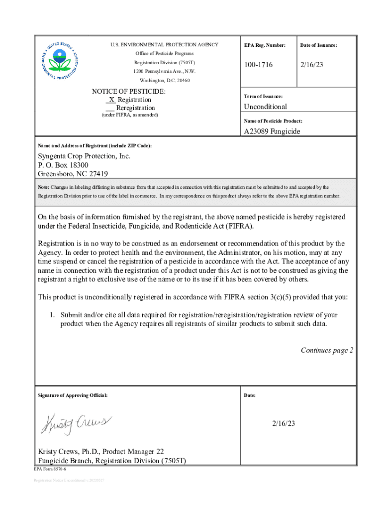 U.S. ENVIRONMENTAL PROTECTION AGENCY EPA Reg. Number:Date of Issuance:10017162/16/23Office of Pesticide Programs Registration Division (7505T) 1200 Pennsylvania Ave., N.W. Washington, D.C. 20460NOTICE