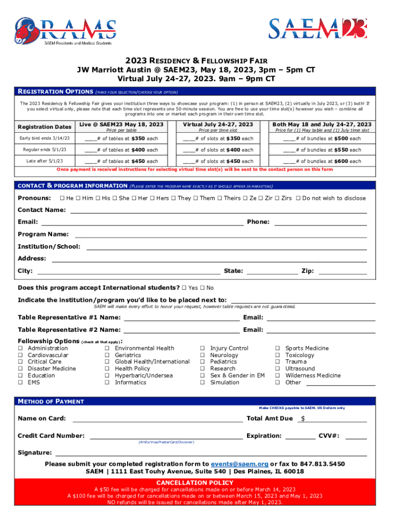 2023 RESIDENCY & FELLOWSHIP FAIR Marriott Austin @ SAEM23, May 18, 2023, 3pm 5pm CT Virtual July 2427, 2023. 9am 9pm CT REGISTRATION OPTIONS(MAKE YOUR SELECTION/CHOOSE YOUR OPTION)The 2023 Residency