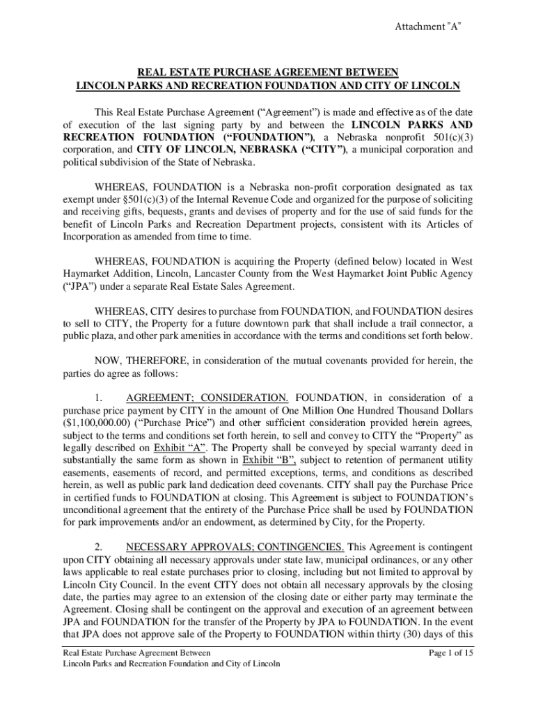 Attachment \” A\” REAL ESTATE PURCHASE AGREEMENT BETWEEN LINCOLN PARKS AND RECREATION FOUNDATION AND CITY OF LINCOLN This Real Estate Purchase Agreement (Agreement) is made and effective as of