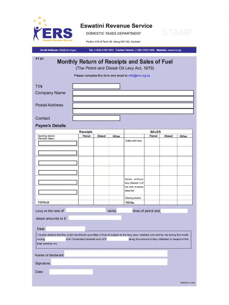 Eswatini Revenue Service DOMESTIC TAXES DEPARTMENT Portion 419 of Farm 50, Along MR 103, Exulting Email Address: info@ers.org.szFT 01Tel: (+268) 2406 4000 Contact Center: (+268) 2406 4050 Website: