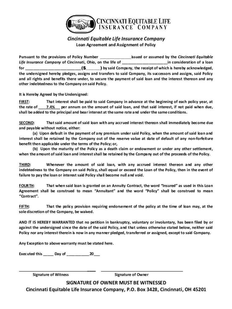 Cincinnati Equitable Life Insurance Company Loan Agreement and Assignment of Policy Pursuant to the provisions of Policy Number ___issued or assumed by the Cincinnati Equitable Life Insurance Company