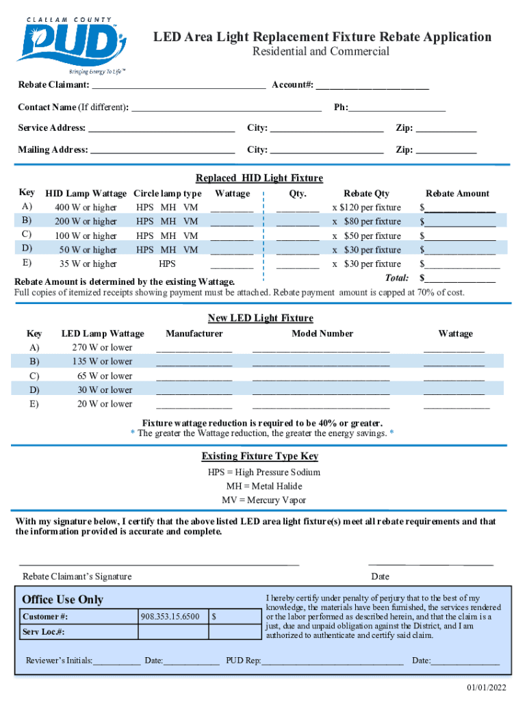 LED Area Light Replacement Fixture Rebate Application Residential and CommercialRebate Claimant:Account#: ___Contact Name (If different):pH:Service Address:City:Zip:Mailing Address:City:Zip:Replaced