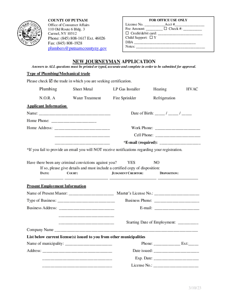 PUTNAM COUNTY PLUMBING/MECHANICAL TRADES BOARD 110 Old Route 6, Building #3, Carmel, New York 10512 Phone No. 8458081617 Ext. 46026 Fax No. 8458081928NEW JOURNEYMAN PLUMBING/MECHANICAL TRADES APPLICATION