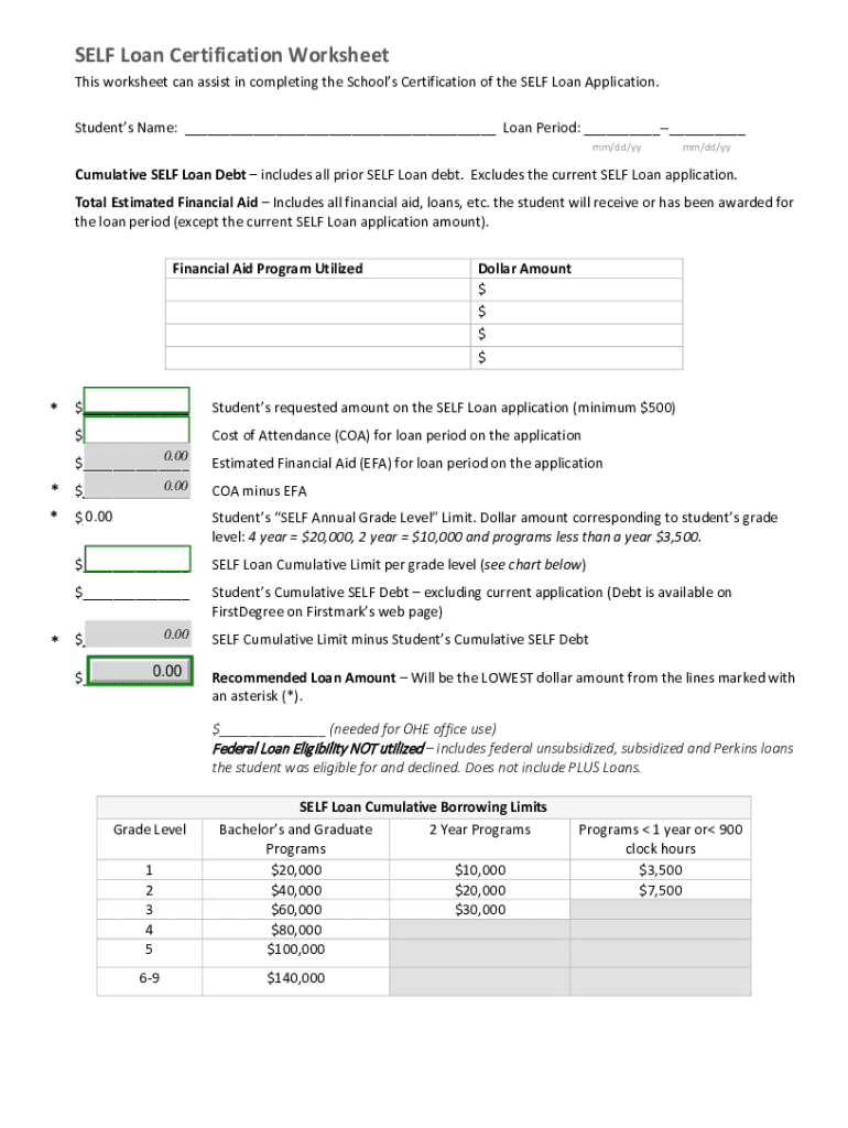 SELF Loan Certification Worksheet This worksheet can assist in completing the Schools Certification of the SELF Loan Application. Students Name: ___ Loan Period: ______ mm/dd/mm/dd/cumulative SELF