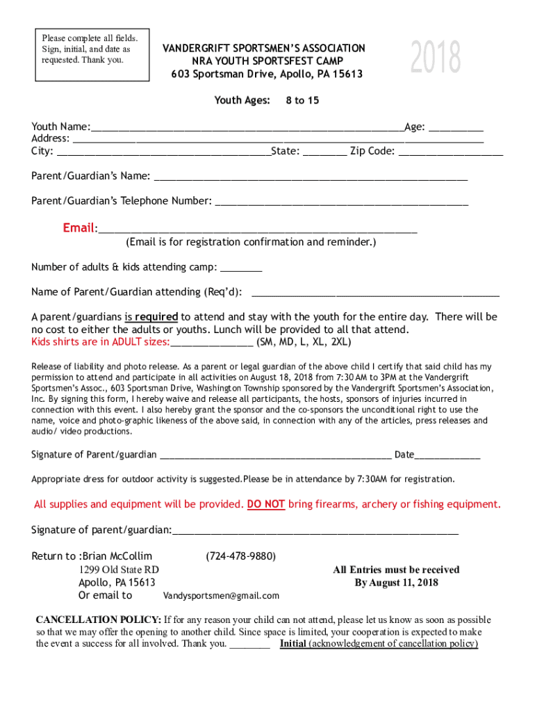 Please complete all fields. Sign, initial, and date as requested. Thank you. VANDERBILT SPORTSMEN ASSOCIATION NRA YOUTH The SPORTIEST CAMP 603 Sportsman Drive, Apollo, PA 15613 Youth Ages:8 to 15Youth