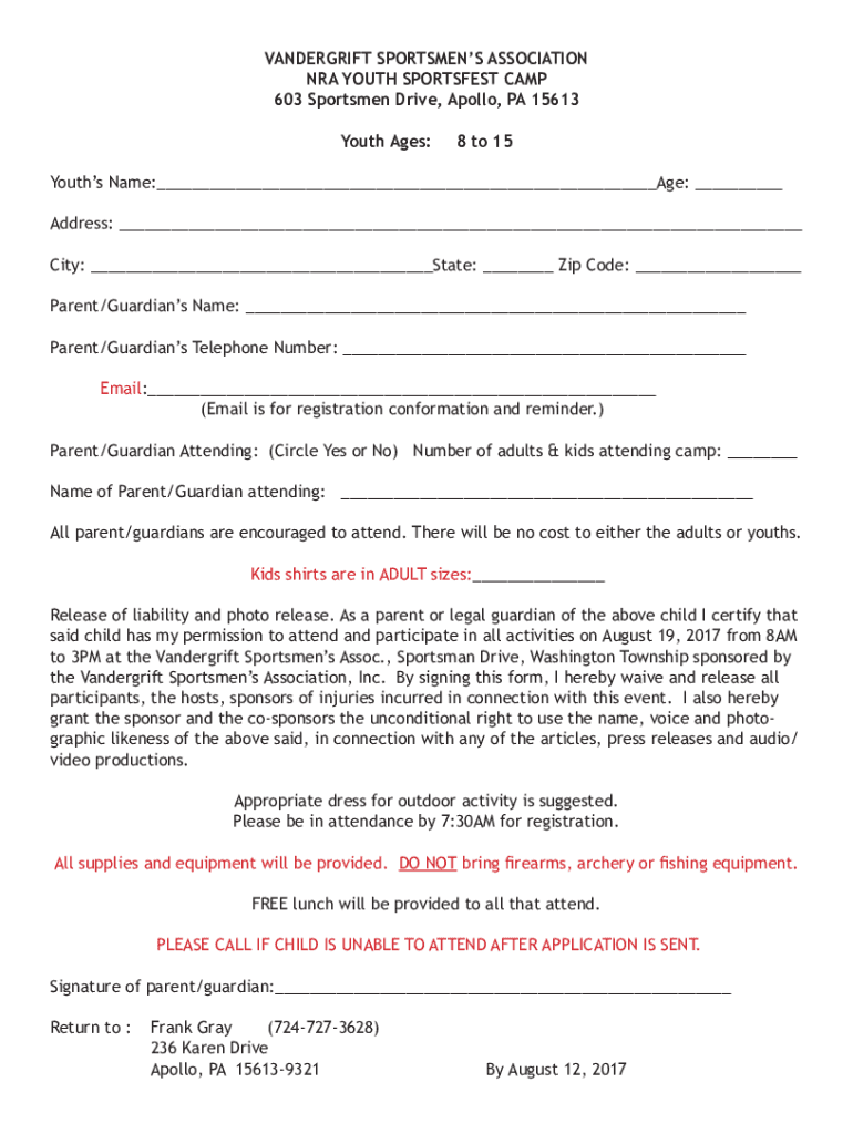 VANDERBILT SPORTSMEN ASSOCIATION NRA YOUTH The SPORTIEST CAMP 603 Sportsmen Drive, Apollo, PA 15613 Youth Ages:8 to 15Youths Name:___Age: ___ Address: ___ City: ___State: ___ Zip Code: ___ Parent/Guardians