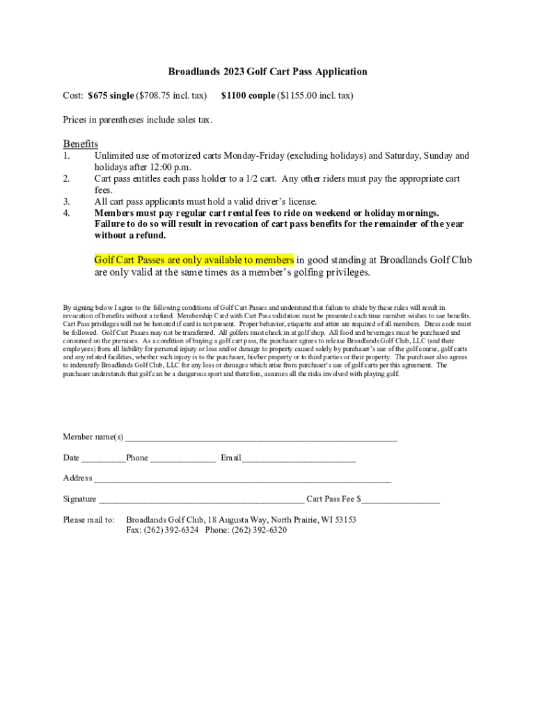 Broad lands 2023 Golf Cart Pass Application Cost: $675 single ($708.75 incl. tax)$1100 couple ($1155.00 incl. tax)Prices in parentheses include sales tax. Benefits 1.2. 3. 4. Unlimited use of motorized