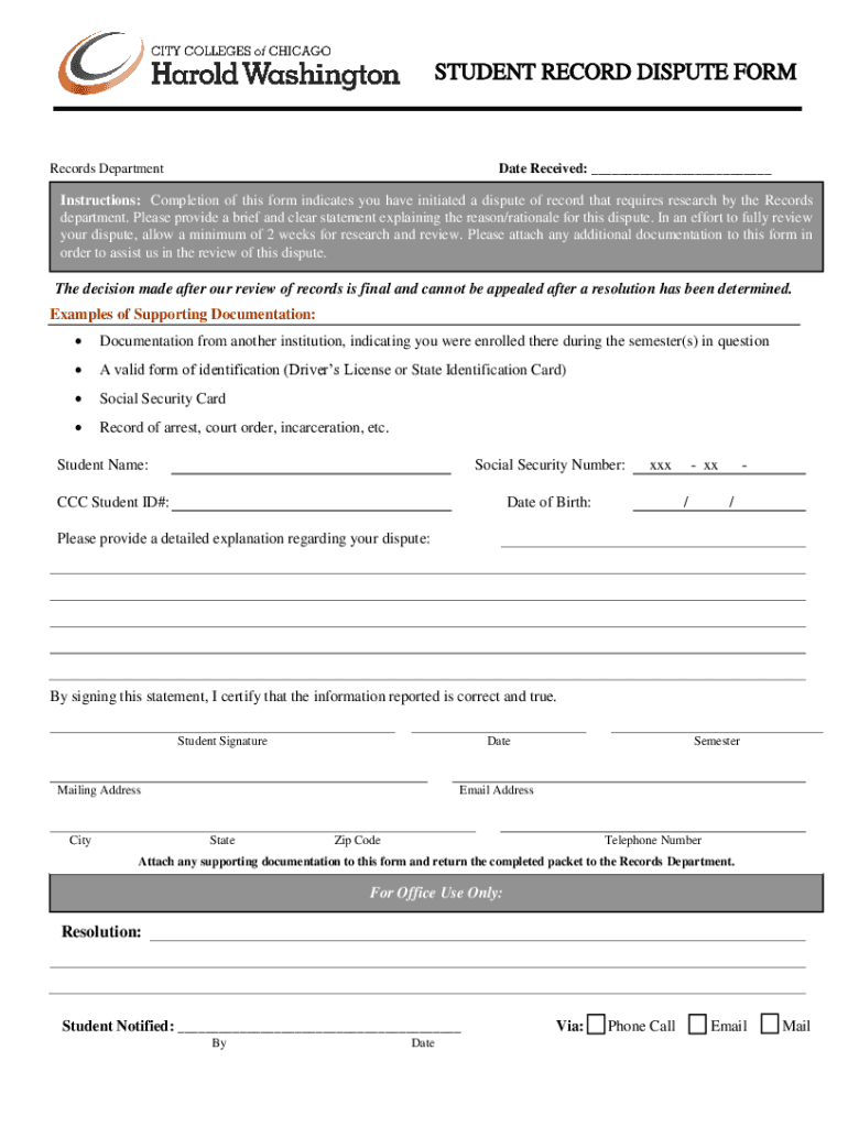 STUDENT RECORD DISPUTE Forewords Departmental Received: ___Instructions: Completion of this form indicates you have initiated a dispute of record that requires research by the Records department.