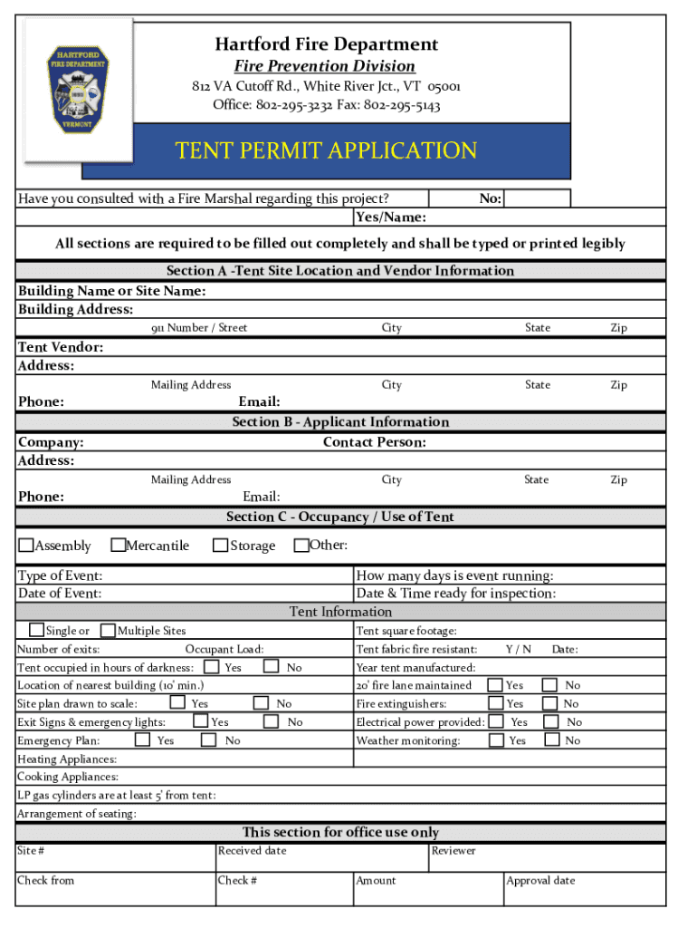 Hartford Fire Department Fire Prevention Division 812 VA Cutoff Rd., White River Jct., VT 05001 Office: 8022953232 Fax: 8022955143TENT PERMIT APPLICATION Have you consulted with a Fire Marshal regarding