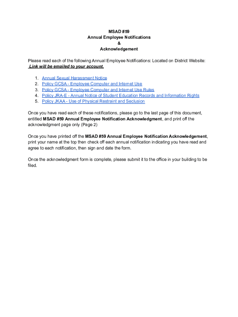MAD #59 Annual Employee Notifications & Acknowledgement Please read each of the following Annual Employee Notifications: Located on District Website: Link will be emailed to your account. 1. 2. 3.