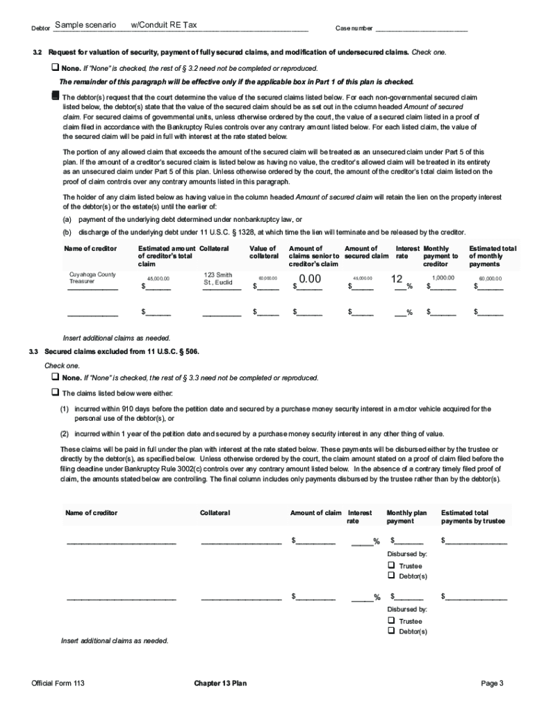 Sample scenario w/Conduit RE Tax Debtor ___Case number ___3.2 Request for valuation of security, payment of fully secured claims, and modification of under secured claims. Check one. None. If None