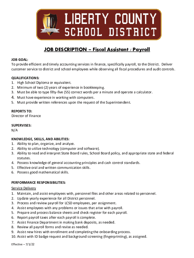 JOB DESCRIPTION Fiscal Assistant / Payroll JOB GOAL: To provide efficient and timely accounting services in finance, specifically payroll, to the District. Deliver customer service to district and
