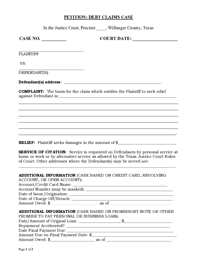 PETITION: DEBT CLAIMS CASE In the Justice Court, Precinct ___, Larger County, Texas CASE NO. ___COURT DATE: ______ PLAINTIFF VS: ___ DEFENDANT(S) Defendant(s) address: ___. COMPLAINT: The basis for