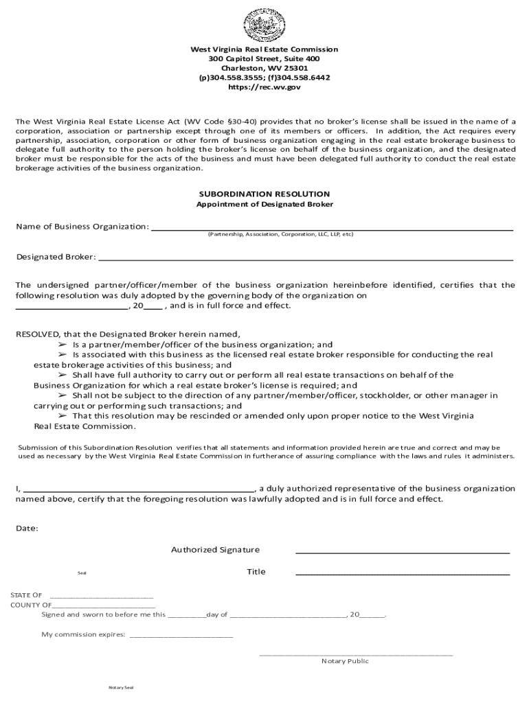 West Virginia Real Estate Commission 300 Capitol Street, Suite 400 Charleston, WV 25301 (p)304.558.3555; (f)304.558.6442 https://rec.wv.govThe West Virginia Real Estate License Act (WV Code 3040)