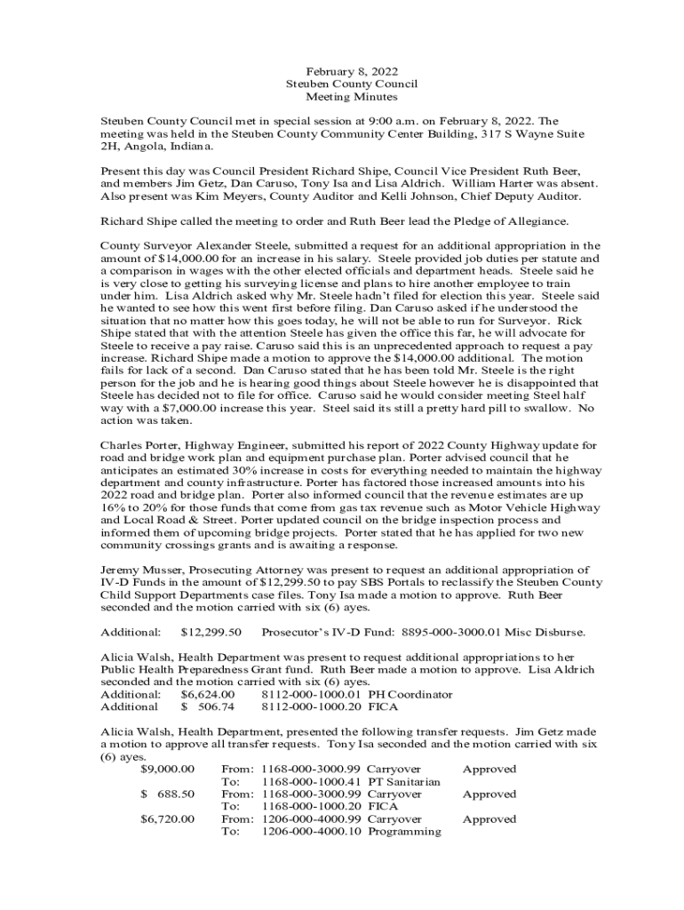 February 8, 2022, Steuben County Council Meeting Minutes Steuben County Council met in special session at 9:00 a.m. on February 8, 2022. The meeting was held in the Steuben County Community Center