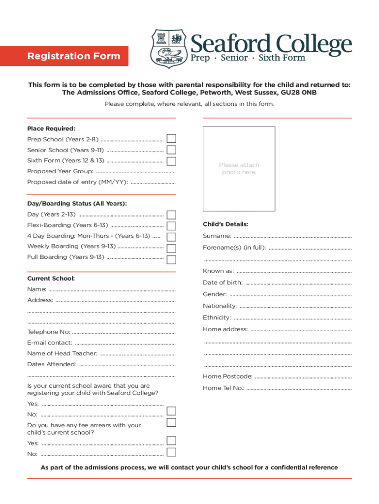 Registration Form This form is to be completed by those with parental responsibility for the child and returned to: The Admissions Office, Seafood College, Pet worth, West Sussex, GU28 0NB Please