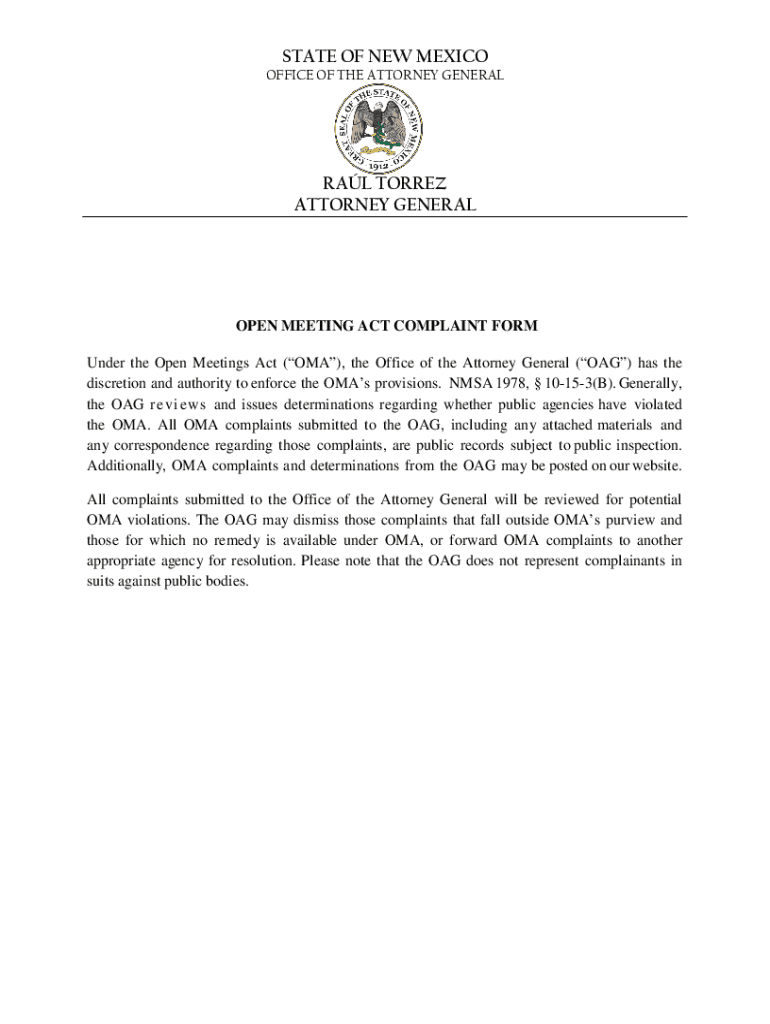 STATE OF NEW MEXICO OFFICE OF THE ATTORNEY GENERAL TORRES ATTORNEY GENERALIZED MEETING ACT COMPLAINT FORM Under the Open Meetings Act (OMA), the Office of the Attorney General (TAG) has the discretion