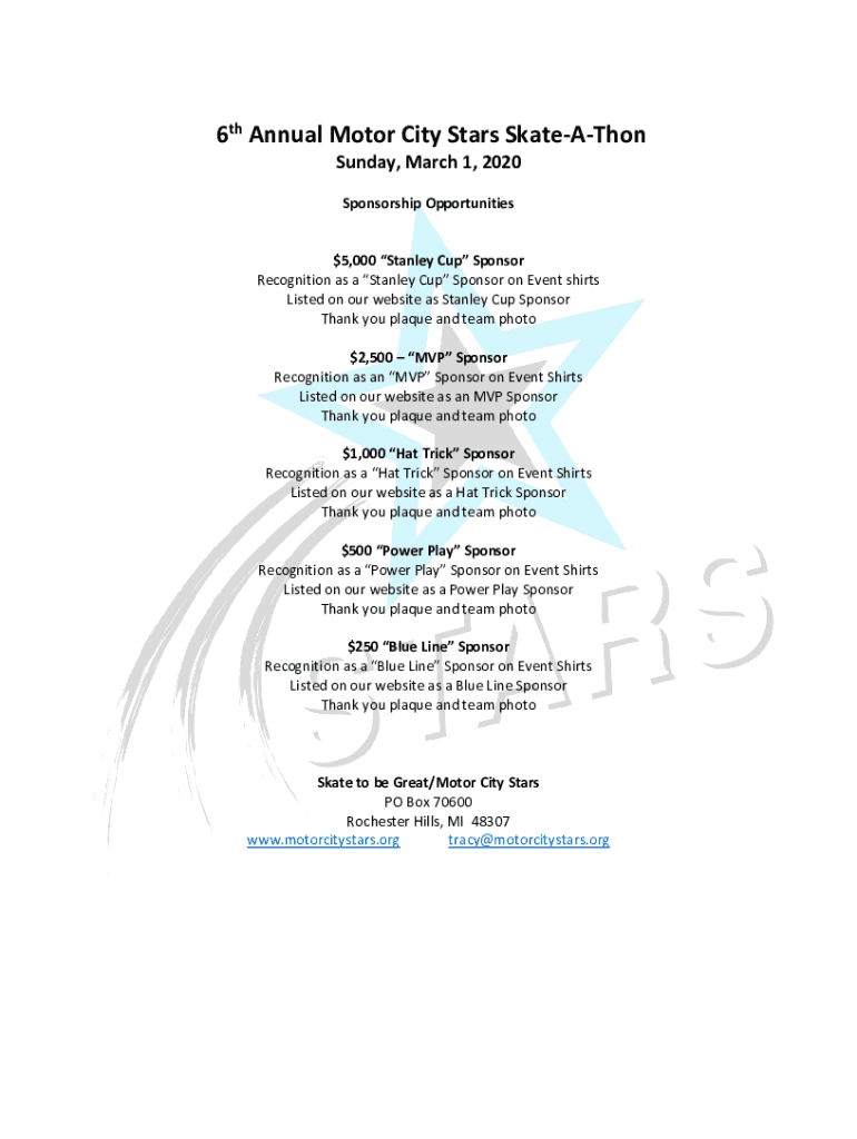 6th Annual Motor City Stars Satiation Sunday, March 1, 2020, Sponsorship Opportunities$5,000 Stanley Cup Sponsor Recognition as a Stanley Cup Sponsor on Event shirts Listed on our website as Stanley